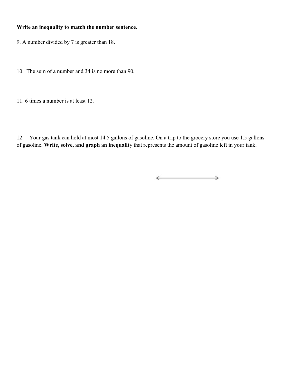 Your gas tank can hold at most 14.5 gallons of gasoline. On a trip to the grocery store you use 1.5 gallons of gasoline. Write, solve, and graph an inequality that represents the amount of gasoline left in your tank.