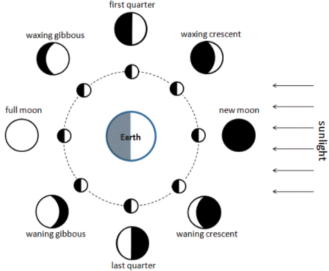 From a top-view, why does the moon appear to be half illuminated in each position?