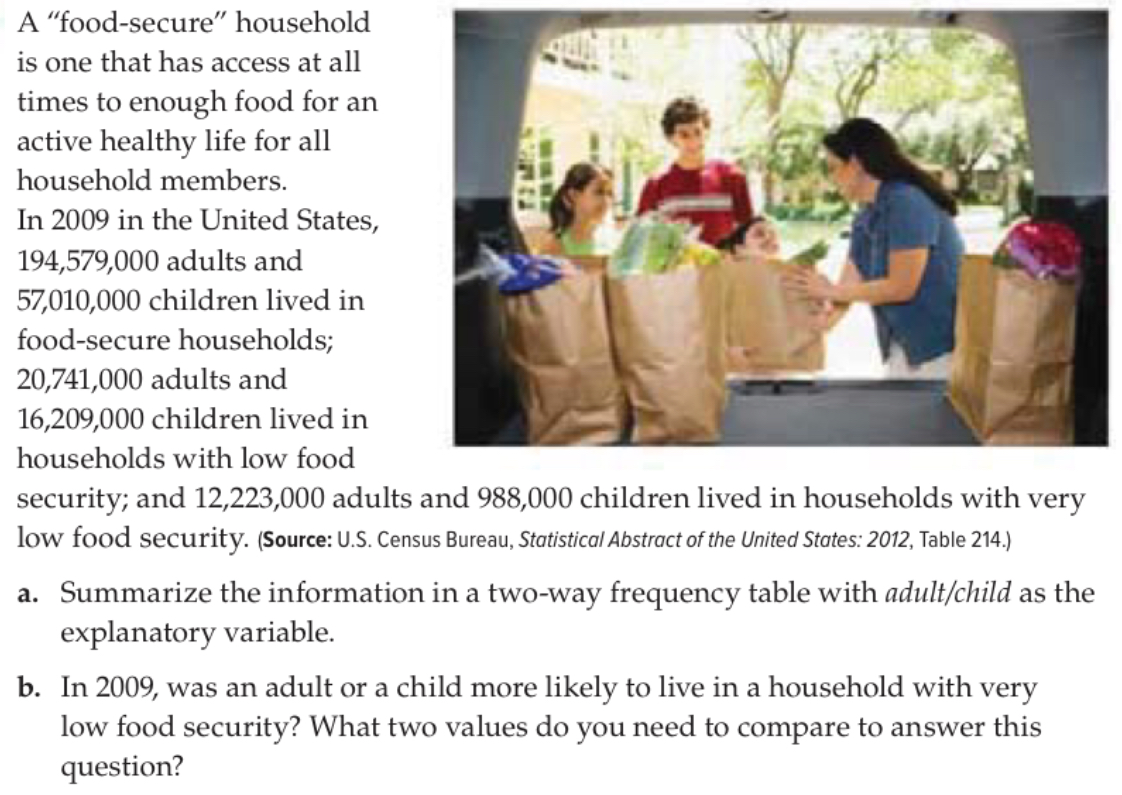 Summarize the information in a two-way frequency table with adult/child as the explanatory variable.