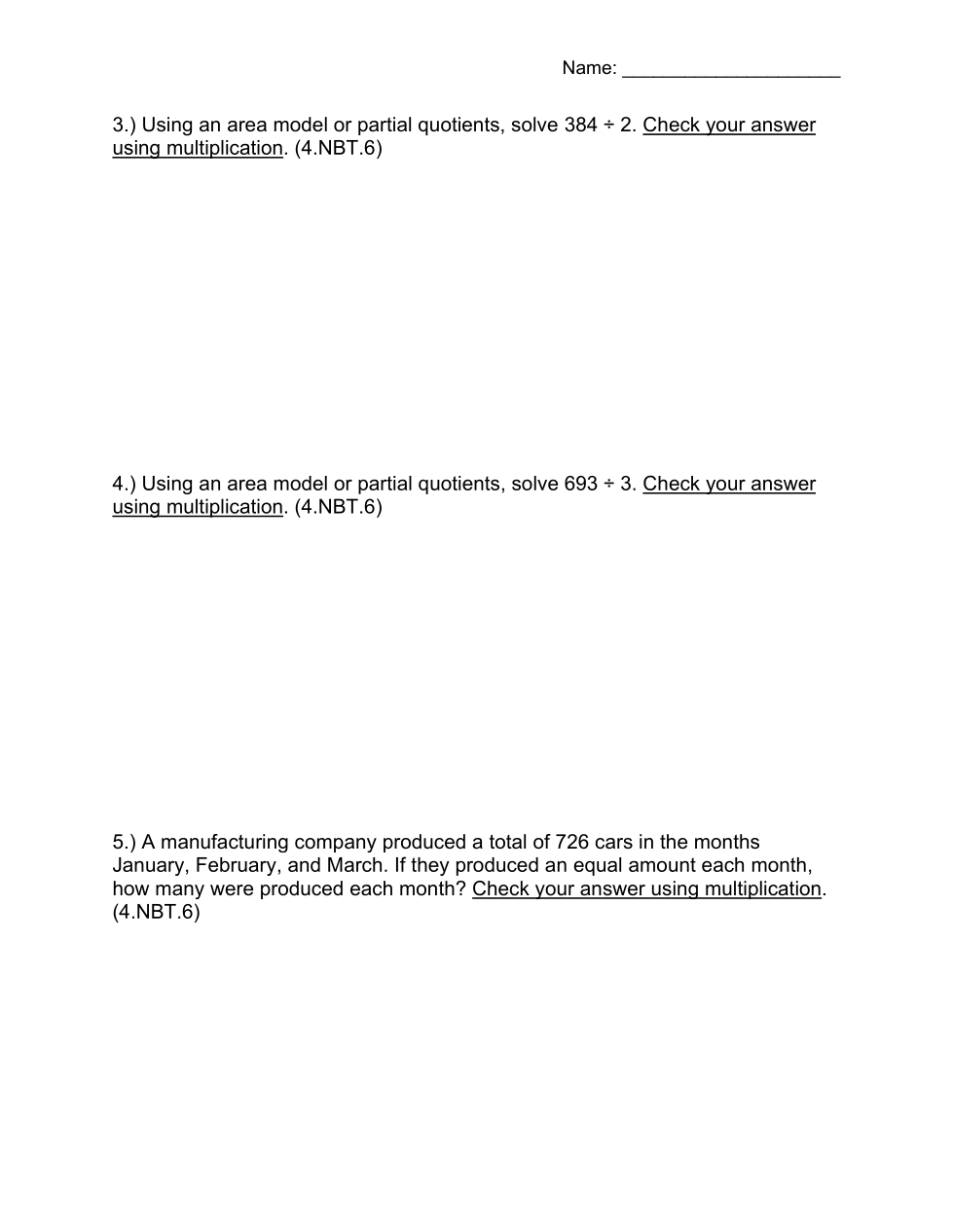 Using an area model or partial quotients, solve 384 ÷ 2. Check your answer using multiplication.