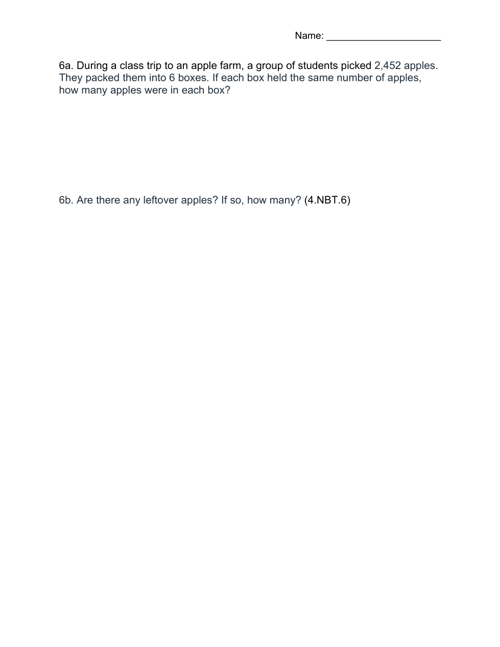 Part A: During a class trip to an apple farm, a group of students picked 2,452 apples. They packed them into 6 boxes. If each box held the same number of apples, how many apples were in each box? (interpret the remainder)