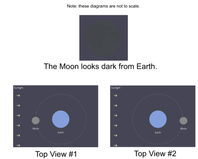 Is Tanisha correct? If she is correct, explain why the Moon always looks dark from Earth in both of these positions. If she is incorrect, explain when the Moon looks dark from Earth and how the light on the Moon should look in each of Tanisha’s diagrams.