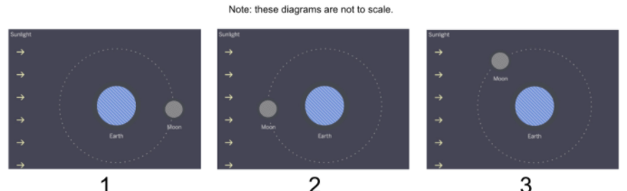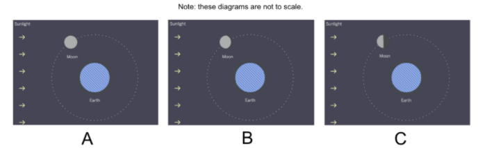 Three students made the diagrams above to show what they think the Moon looks like when it is seen from above (top view). In these diagrams, the sunlight is coming from the left, as shown by the arrows. Which diagram is accurate and why?