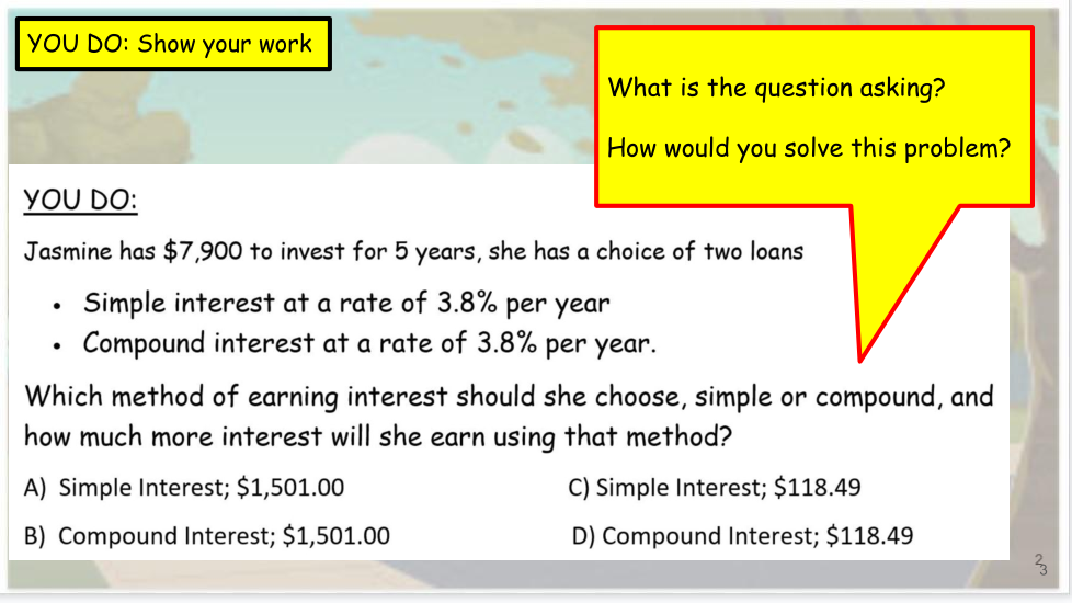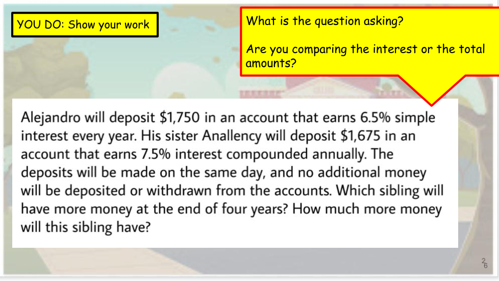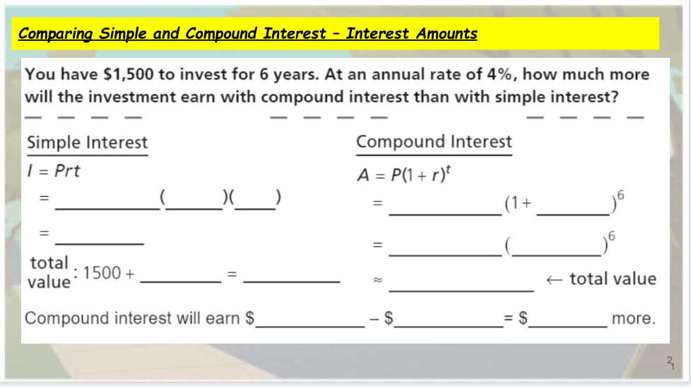 Which method of earning interest should she choose, simple or compound, and how mucg more interest will she earn using that method?