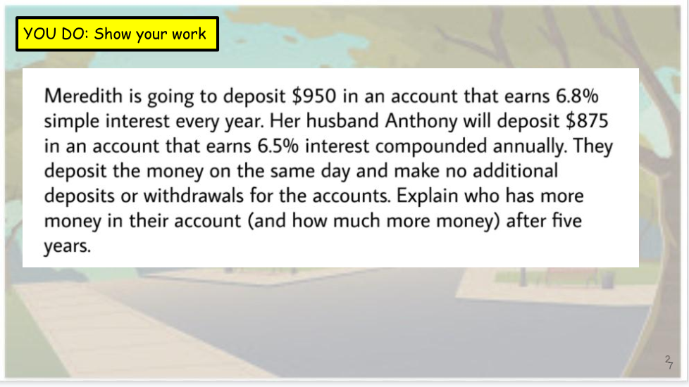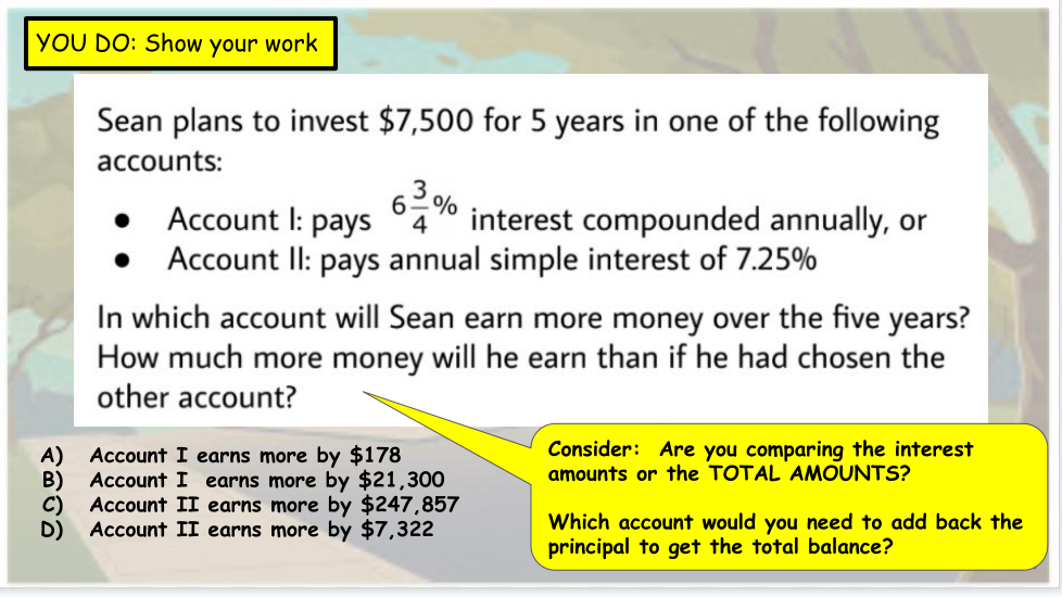 In which account will Sean earn more money over the five years? How much more money will he earn than if he had chosen the other account?