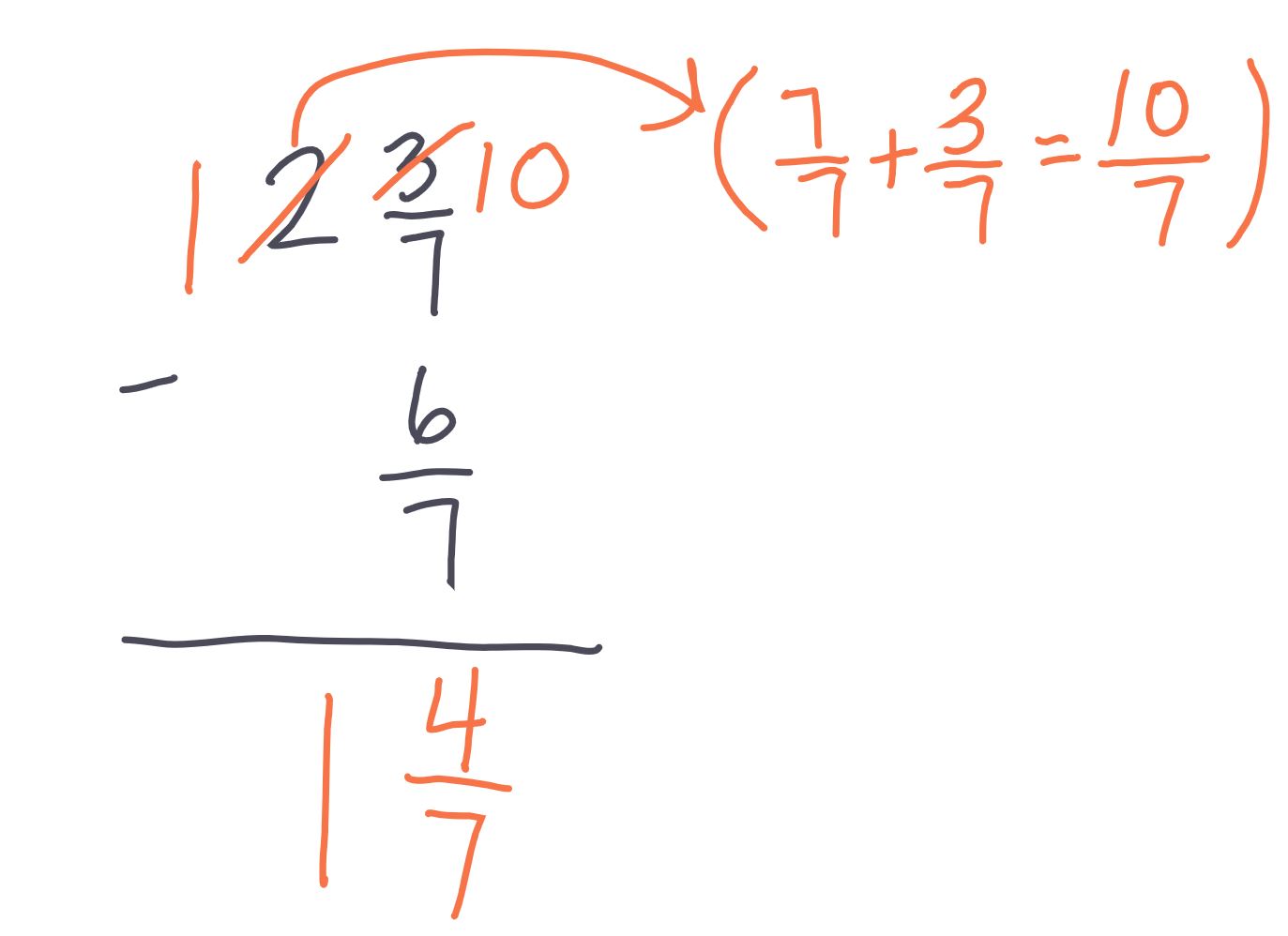 1. Regroup by changing one of your whole numbers into a fraction & add it to the fraction you already have (see red steps with arrow)