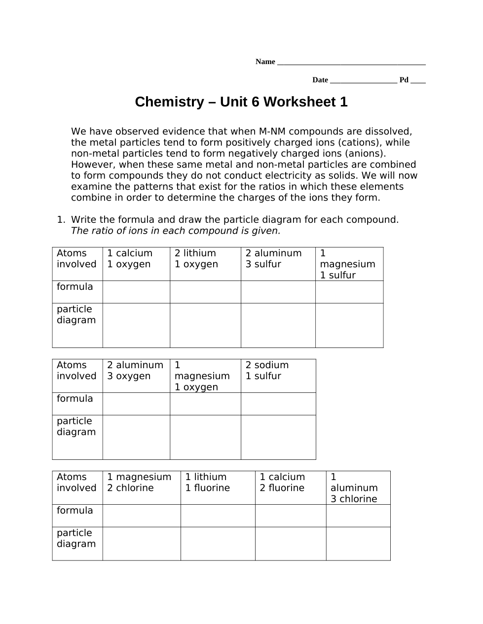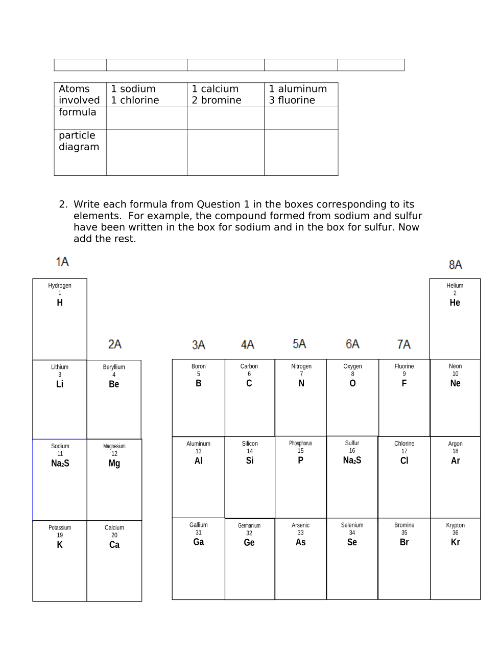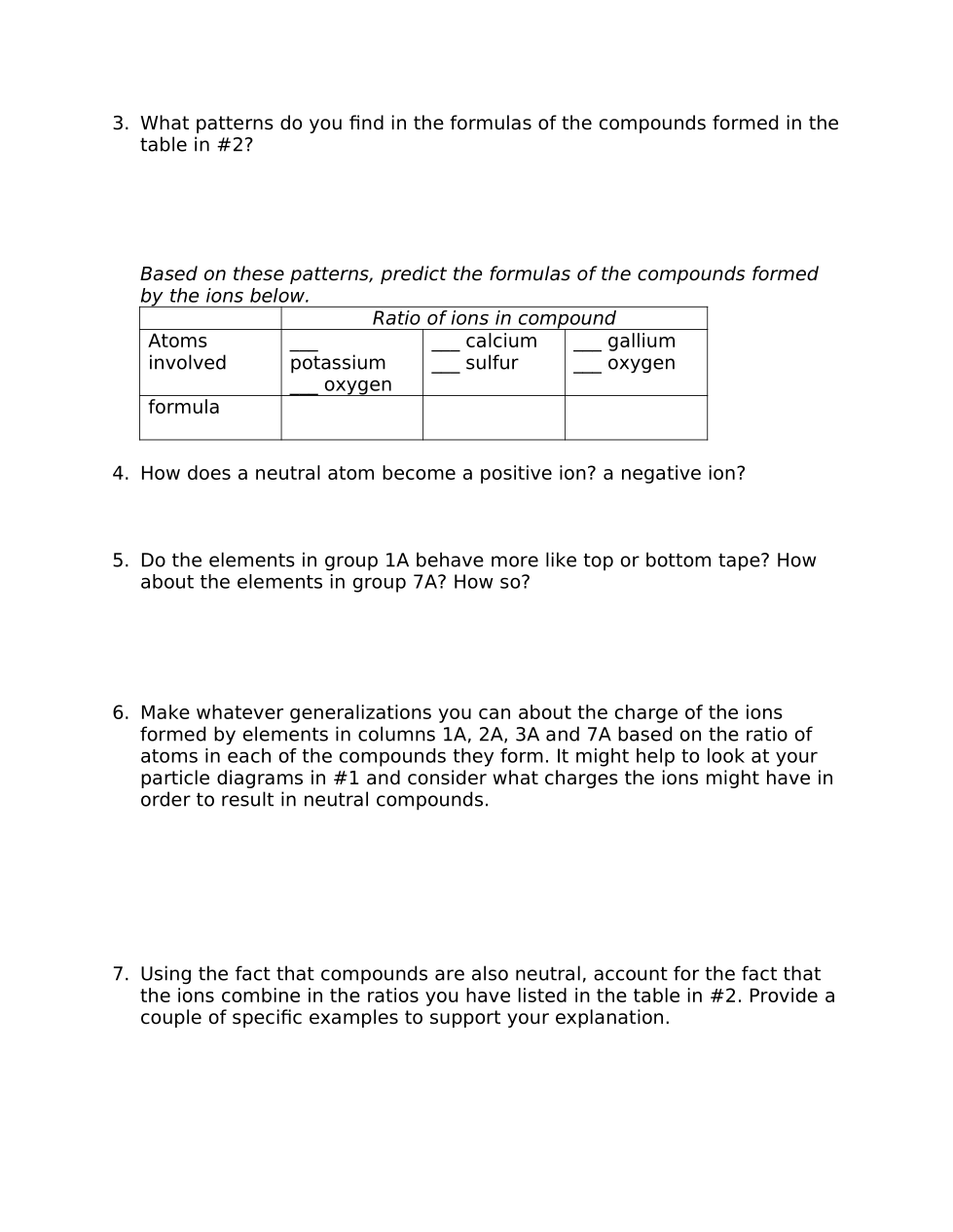 Make whatever generalizations you can about the charge of the ions formed by elements in columns 1A, 2A, 3A and 7A based on the ratio of atoms in each of the compounds they form. It might help to look at your particle diagrams in #1 and consider what charges the ions might have in order to result in neutral compounds.