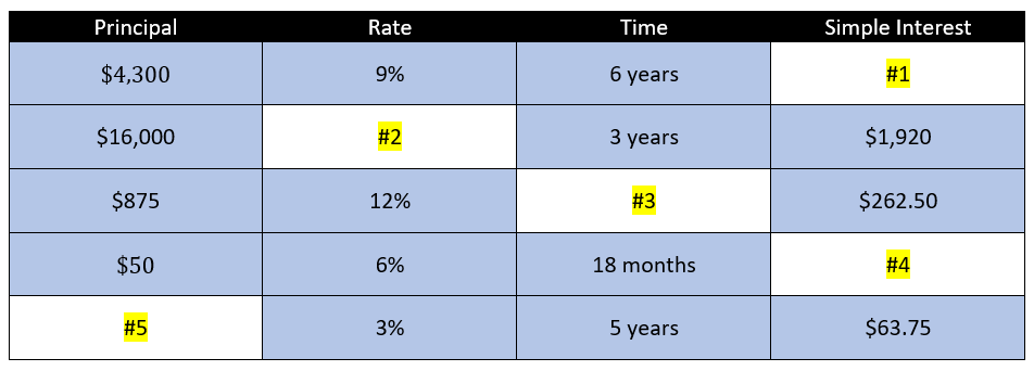 Ace Auto Parts borrowed $6,000 at 6% interest for 5 years to enlarge its display area. Find the simple interest.