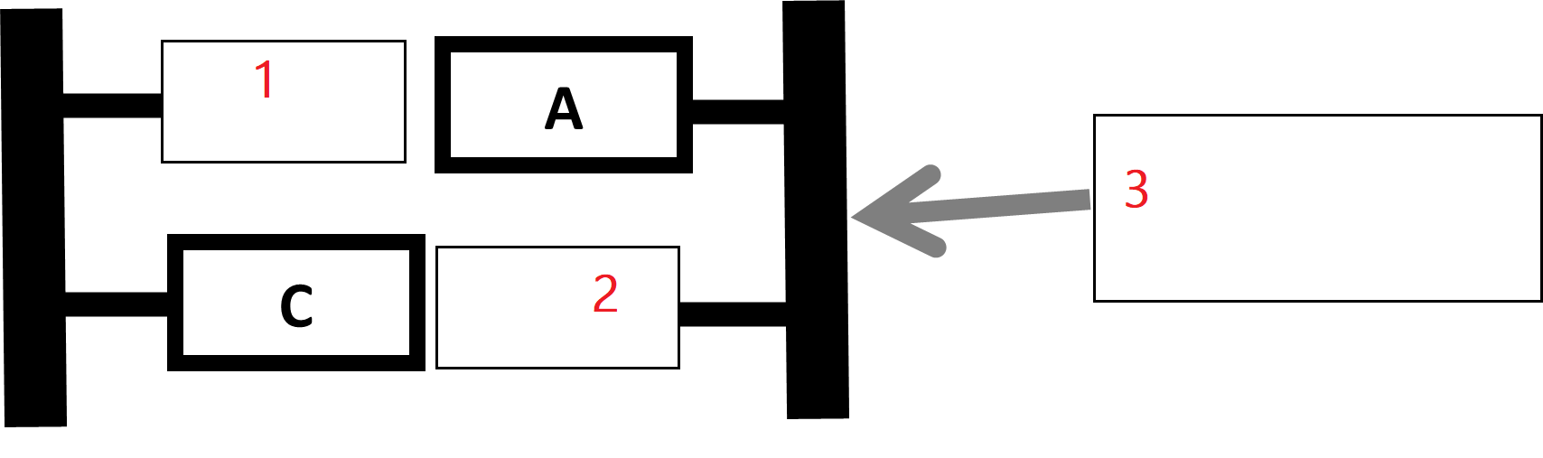 The diagram shows part of a molecule of DNA State the letters of the bases that should be in spaces 1 and 2.Name the outer structure of the DNA molecule(Type your answers as 1 = , 2= ,3=)