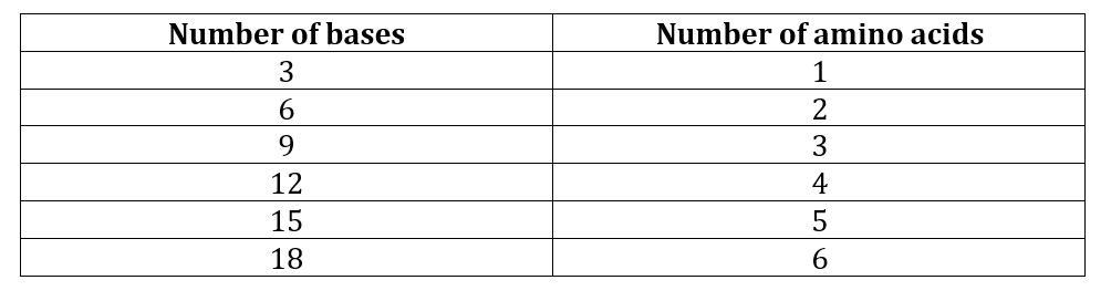The table below shows the relationship between the number of bases in a gene and the number of amino acids in the protein
