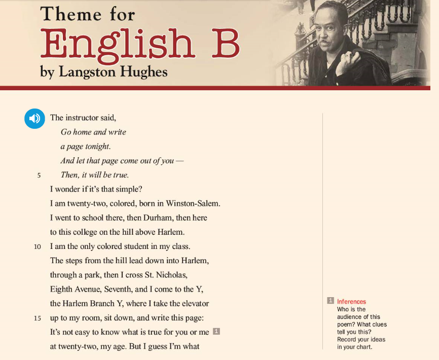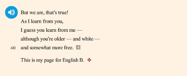The speaker in the poem "The Theme for English B" talks about his identity, things he likes, and how he feels about race.