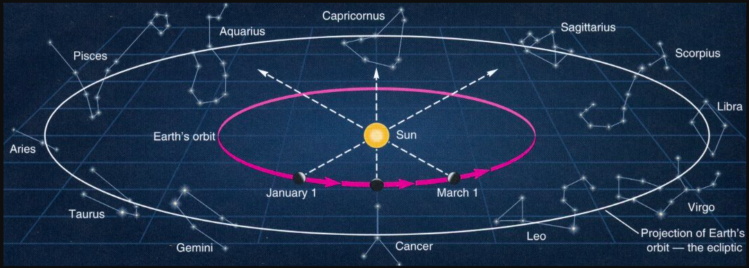 Take a look at the model below of the Earth's path around our Sun. Notice that the figures of the night sky at different points in the year show different constellations. Using this image, create an explanation for why we observe different constellations in our night sky at different parts of the year.