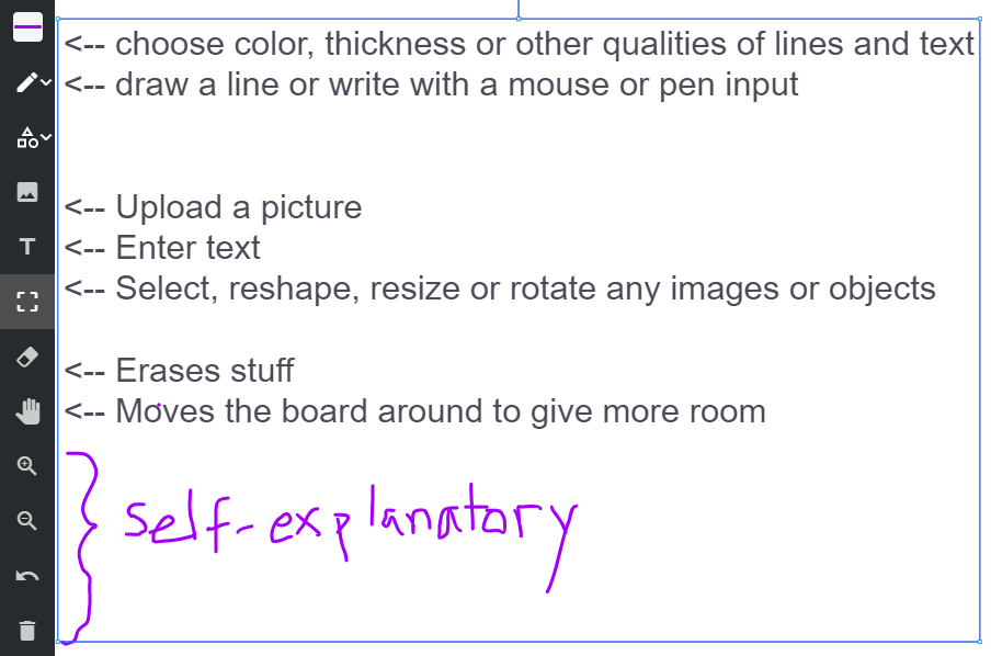 Also below is a picture that gives you the functions of the editing icons you will find in any "show your work" whiteboard. NOTE: It will probably be faster to use the built-in editing tools, but if you are having any problems, you can always upload a photo of the problem's work completed on paper to any "show your work" whiteboard.