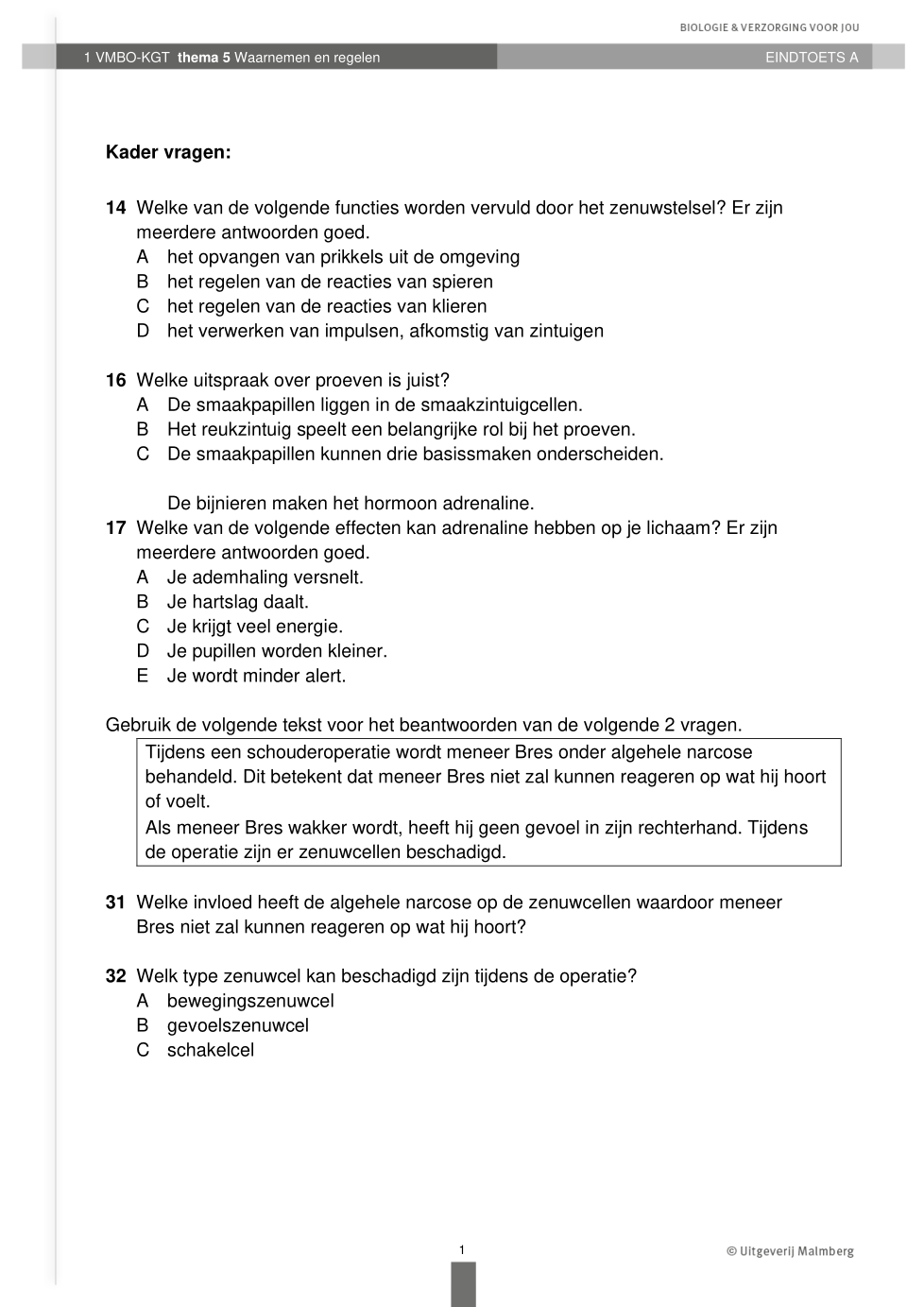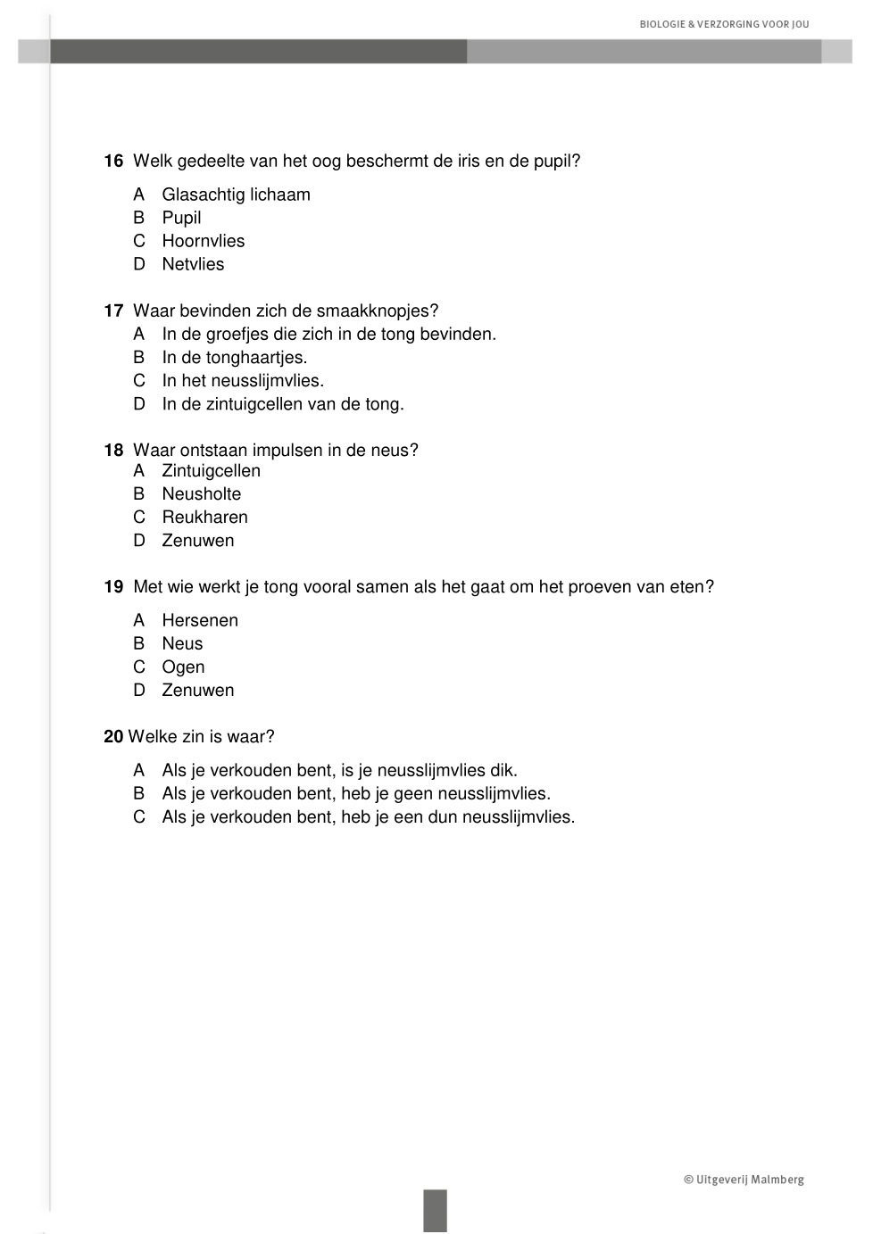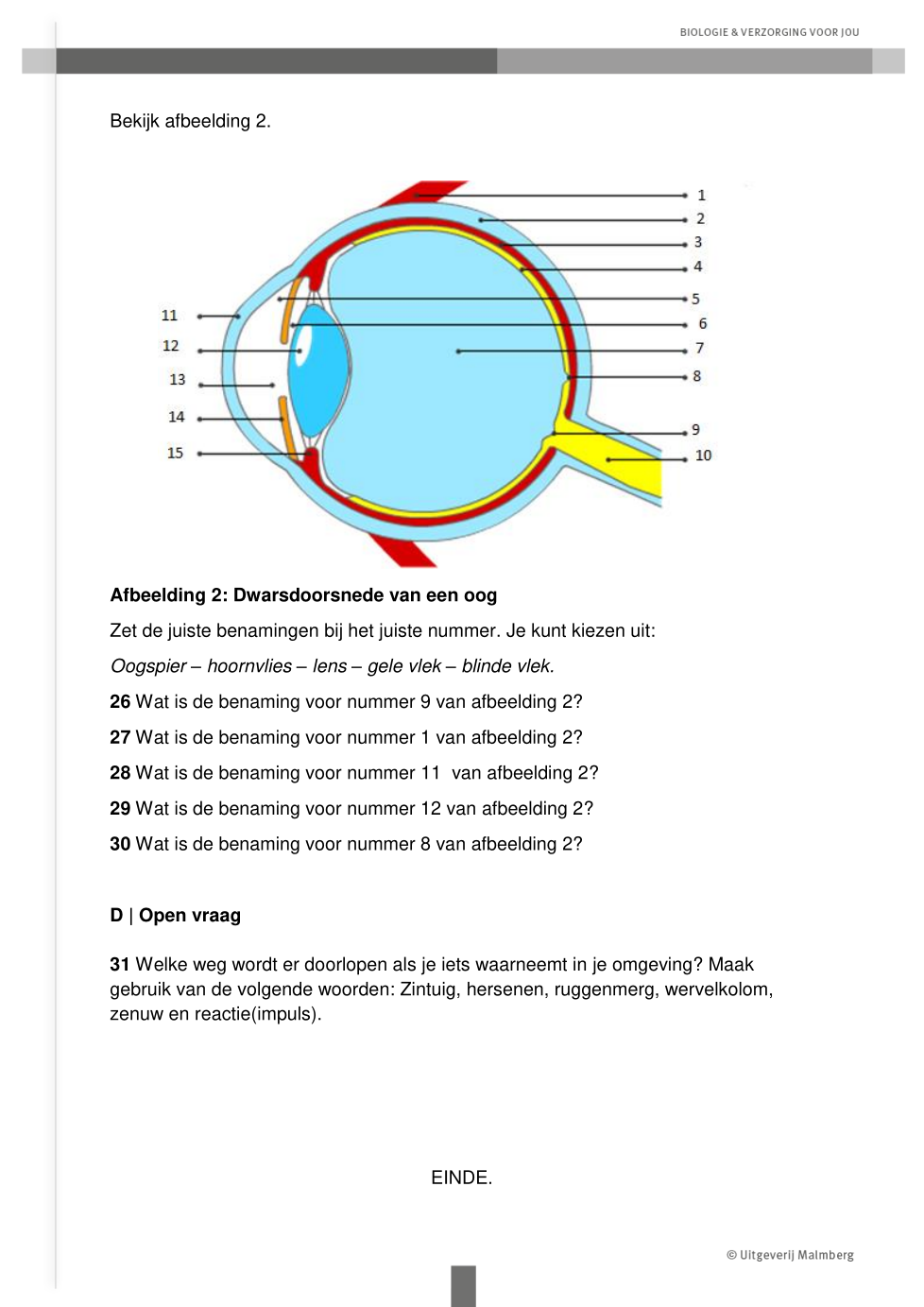 Zet de juiste benamingen bij het juiste nummer. Je kunt kiezen uit:A:Oogspier – B:hoornvlies – C:lens – D:gele vlek – E:blinde vlek.