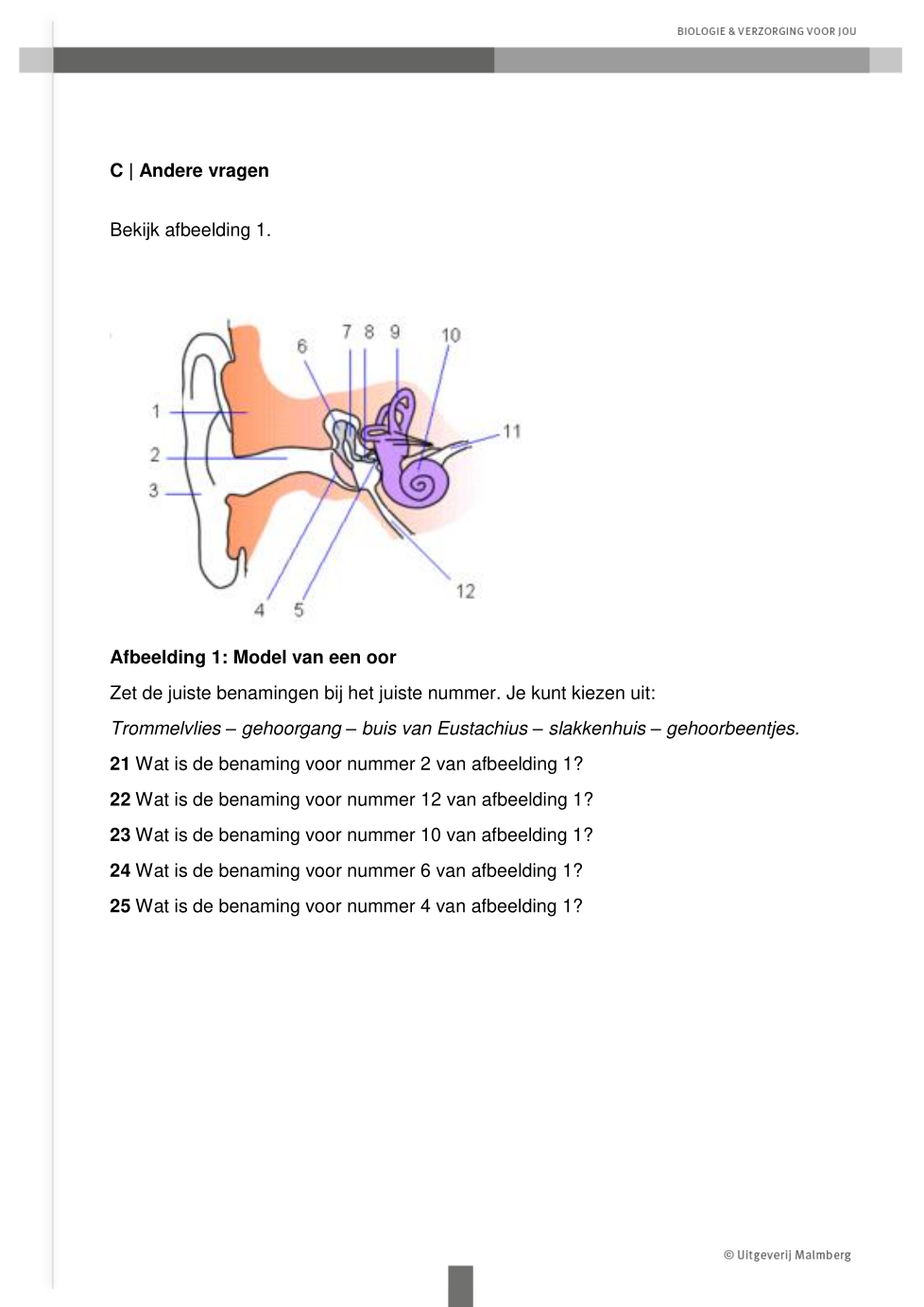 Zet de juiste benamingen bij het juiste nummer. Je kunt kiezen uit:A:Trommelvlies – B:gehoorgang – C:buis van Eustachius – D:slakkenhuis – E:gehoorbeentjes.
