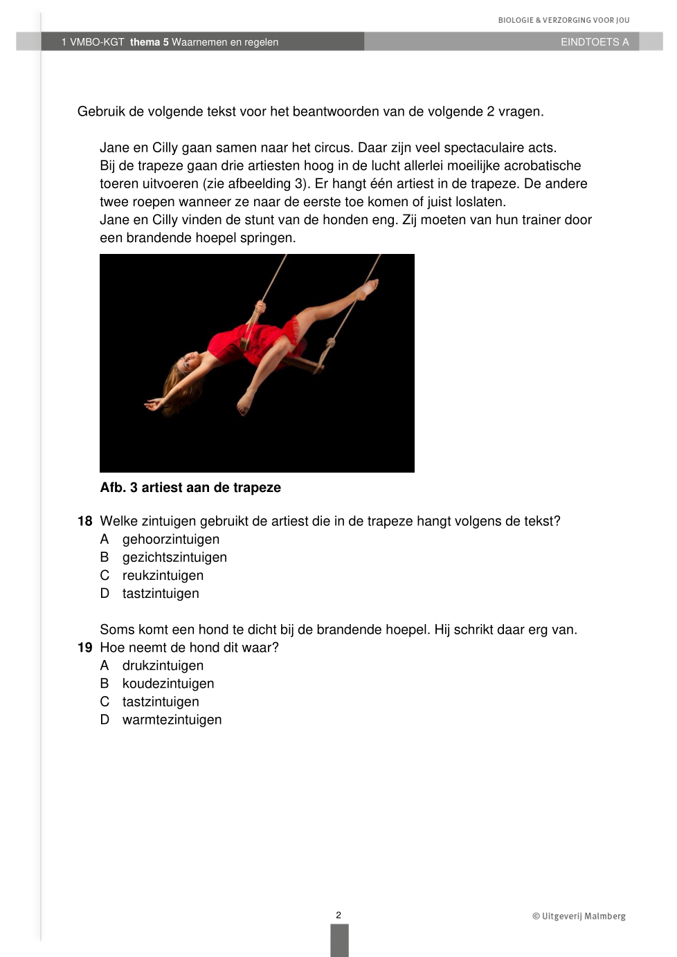 Welke zintuigen gebruikt de artiest die in de trapeze hangt volgens de tekst?