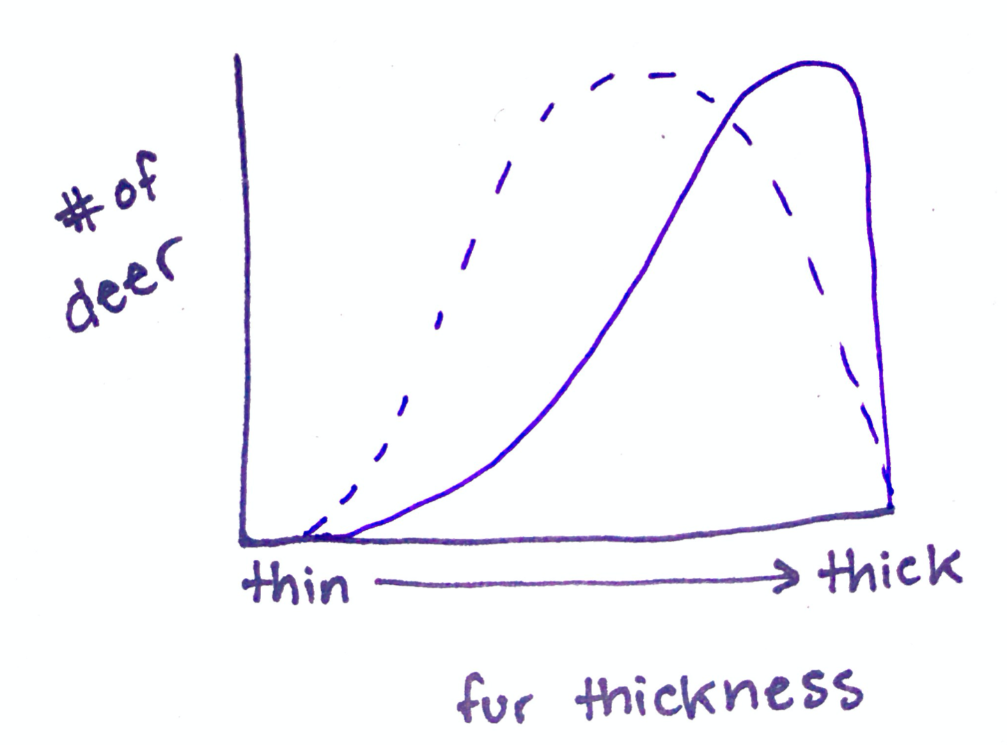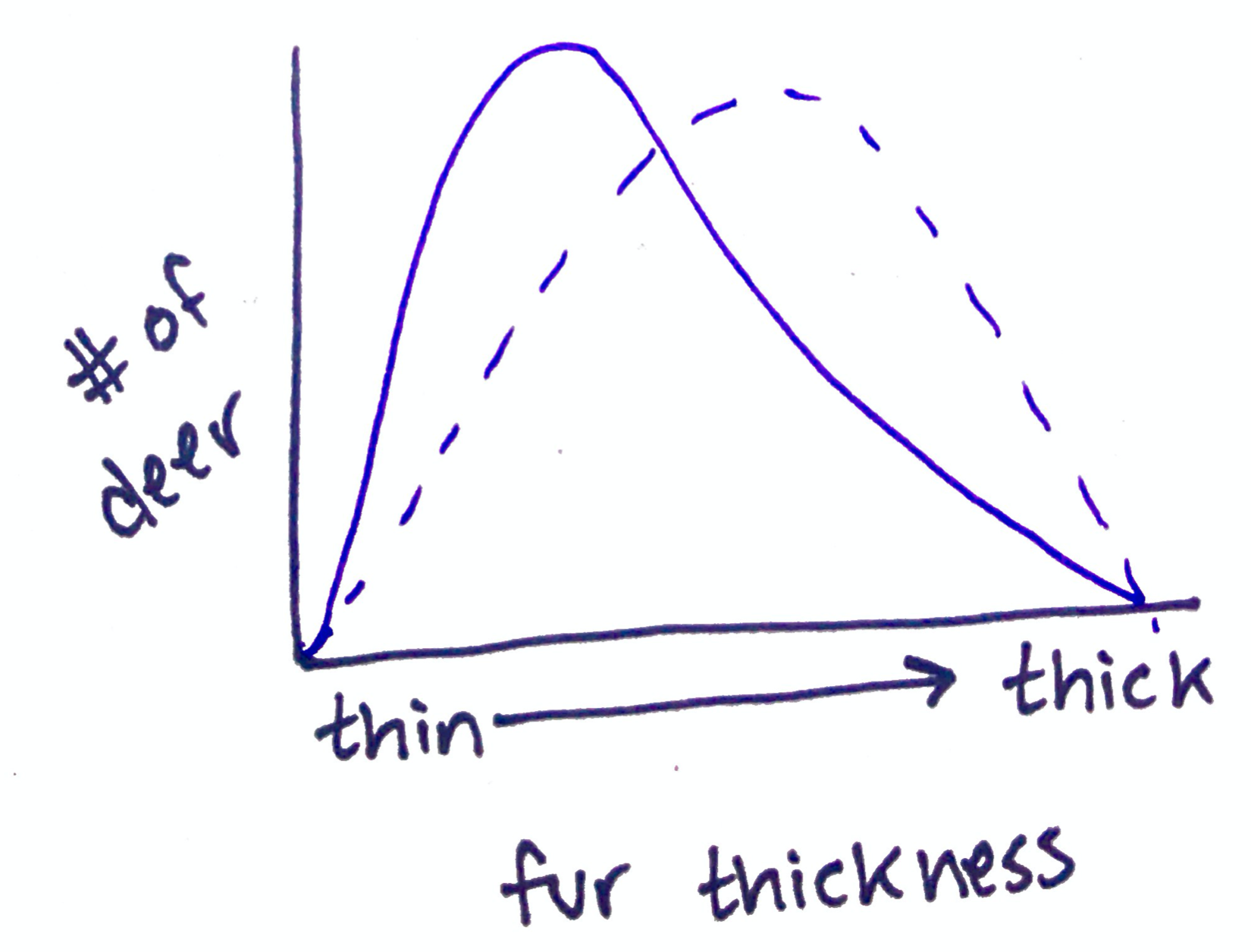 A population of deer with a variety of fur thicknesses in Vermont is facing colder winters recently. Deer with thicker fur are more likely to survive and after 5 years the majority of the deer in the population have thicker coats than was noted 5 years before.