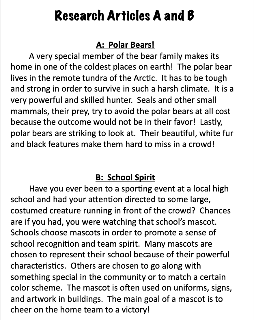 Write an essay explaining why a polar bear might be a good choice for a school’s mascot. Use details from both passages in your essay. Write a third body paragraph for this essay. The topic sentence is: Polar bears would make a great mascot because they represent a predator. Your paragraph should include the topic sentence, details and text evidence, and a closing sentence.