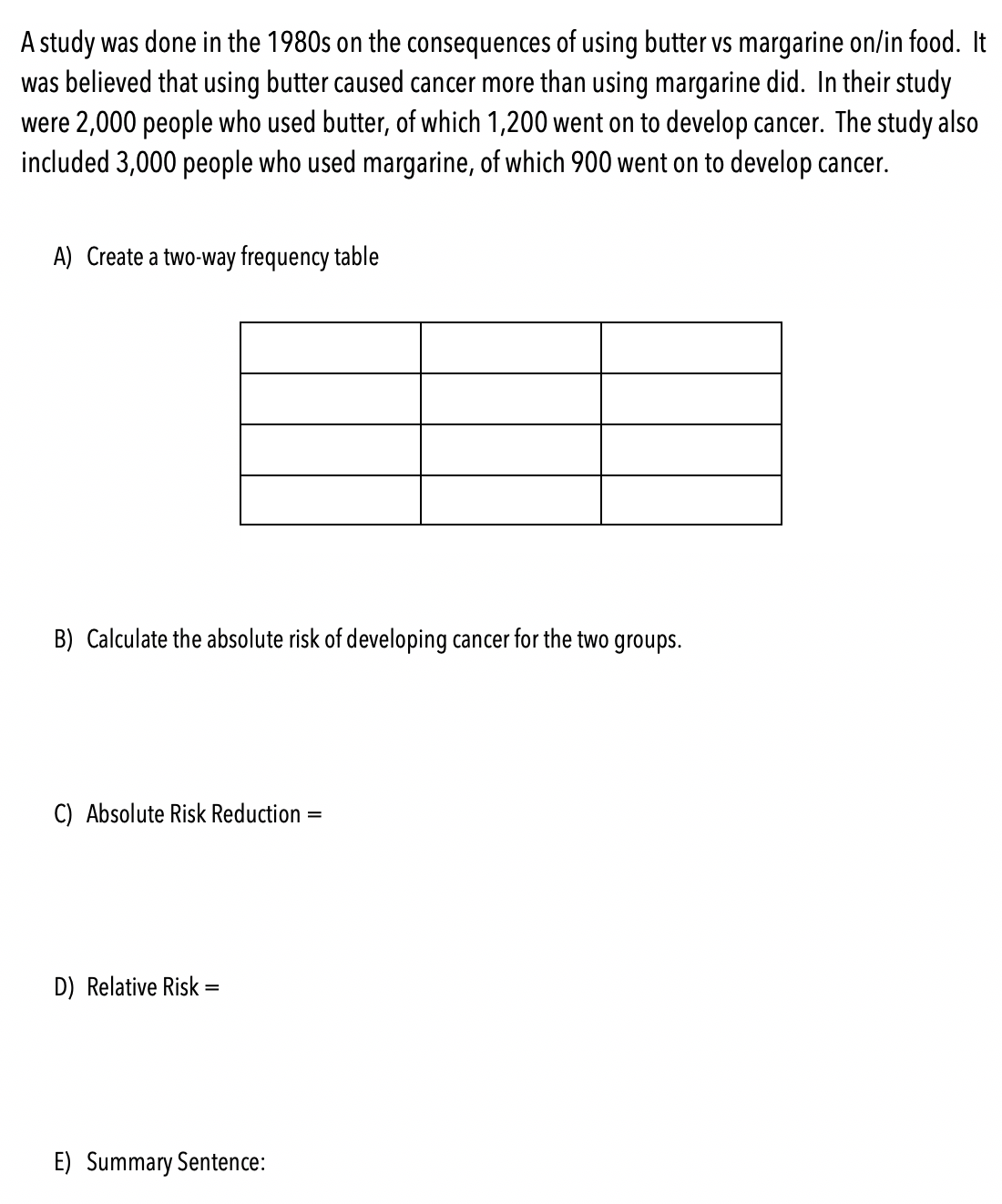 Calculate the absolute risk of developing cancer for the two groups. Clearly label your work.