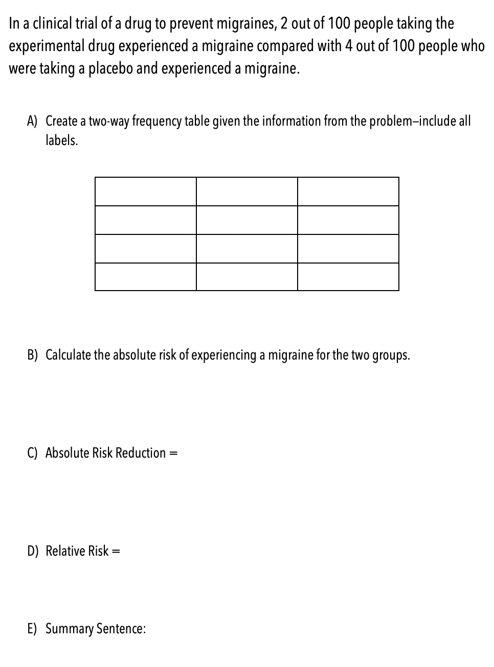 Calculate the absolute risk of experiencing a migraine for the two groups. Clearly label your work.
