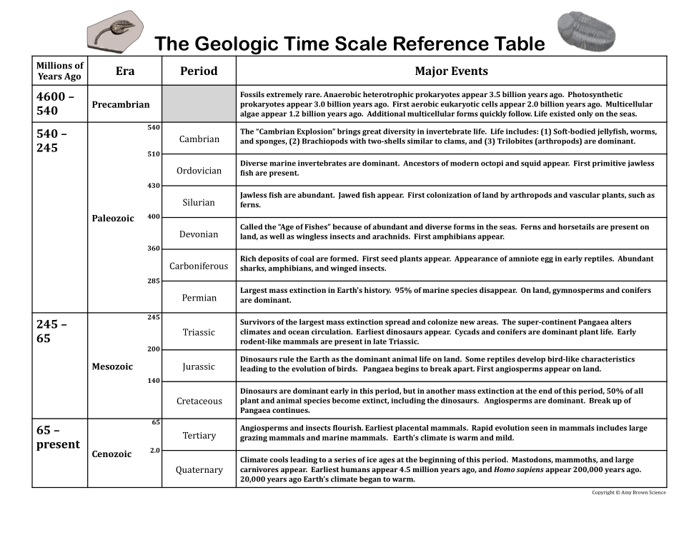 Use the reference table and GTS scale model above to organize the organisms into a Geologic Time Scale model.