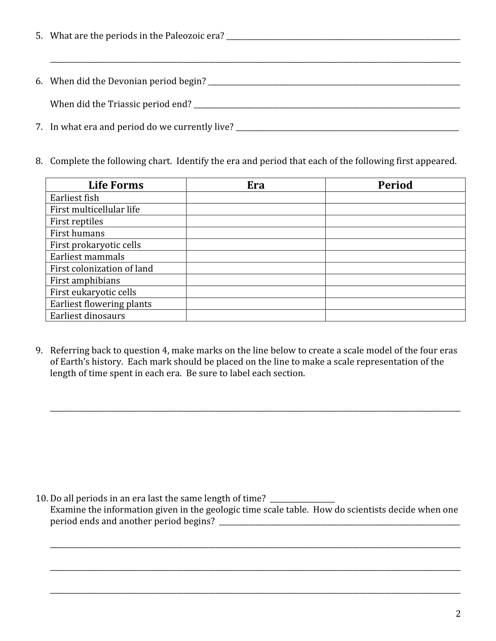 Create marks on the line to make a scale model of the four eras - use the percentage each era has existed from question 4 to help you decide where to put the mark. Make sure to label the eras.