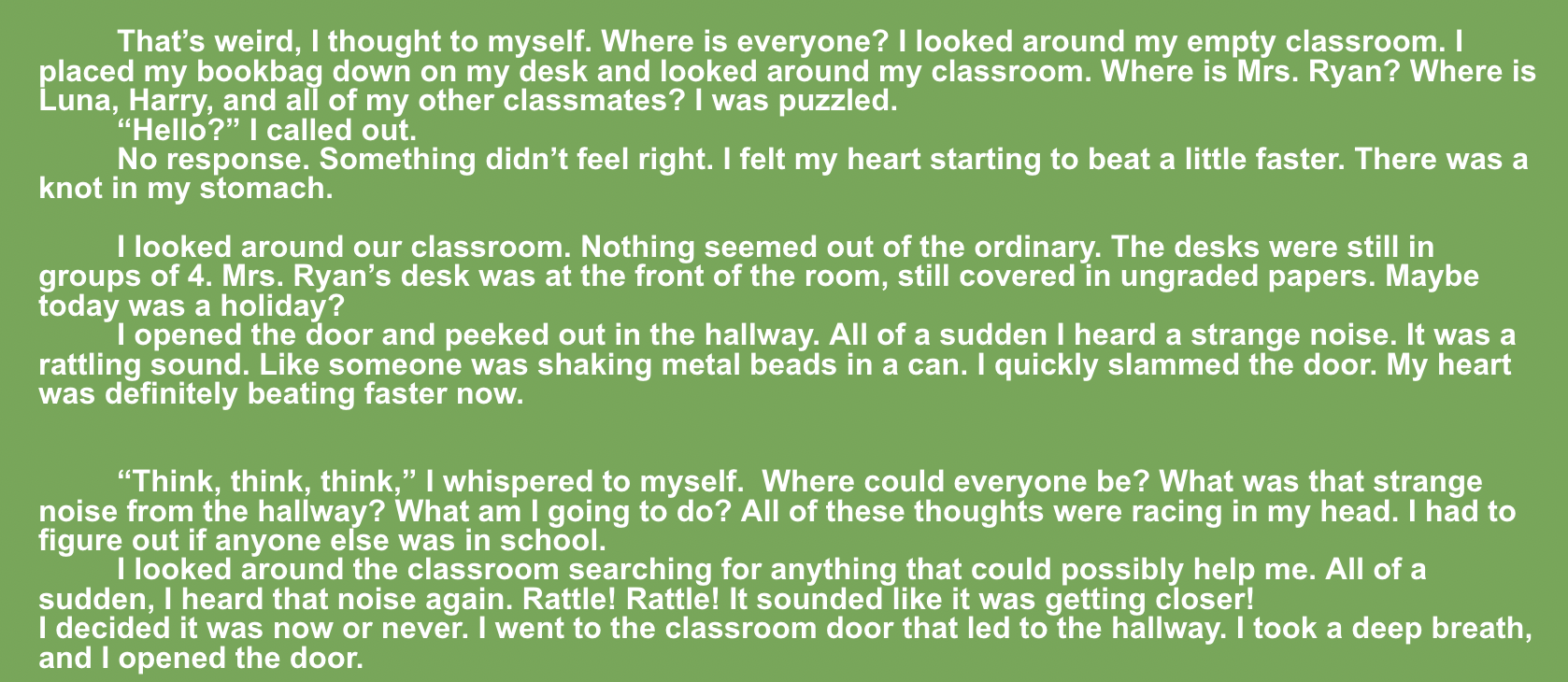 Write a conclusion to the story. Remember to use dialogue and sensory details!