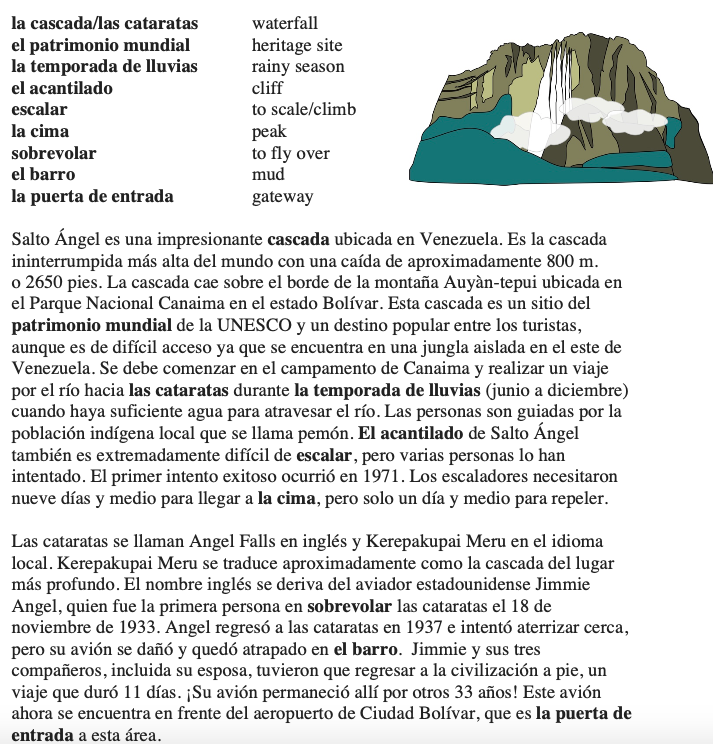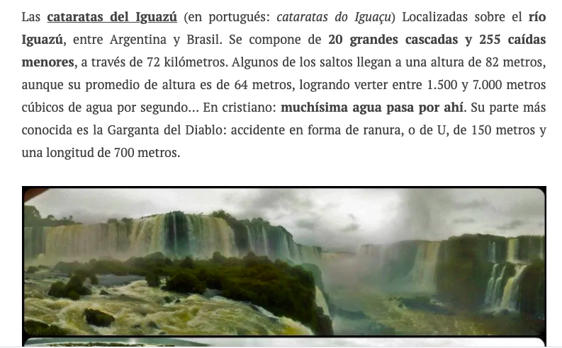 La Cascada: Es una caída más pequeña de agua. Es parte de un arroyo o río pequeño. No cae tanta agua como una catarata. La más famosa en Latinoamérica es Iguazú, localizada entre Argentina y Brasil. | arrow_right_alt | |