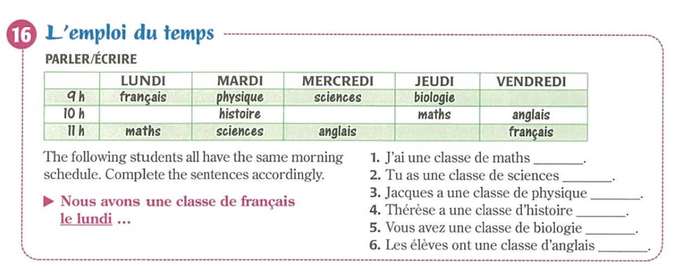 Le lundi, j'ai la physique et le basket-ball, mais je ne nage pas. Le mercredi, j'ai deux cours: les maths et le français, mais je n'ai pas l'anglais. Qu'est-ce que tu fais le lundi et le mercredi?