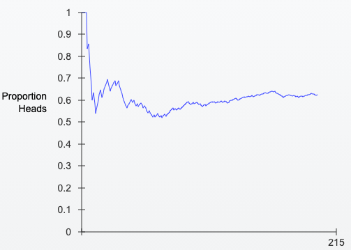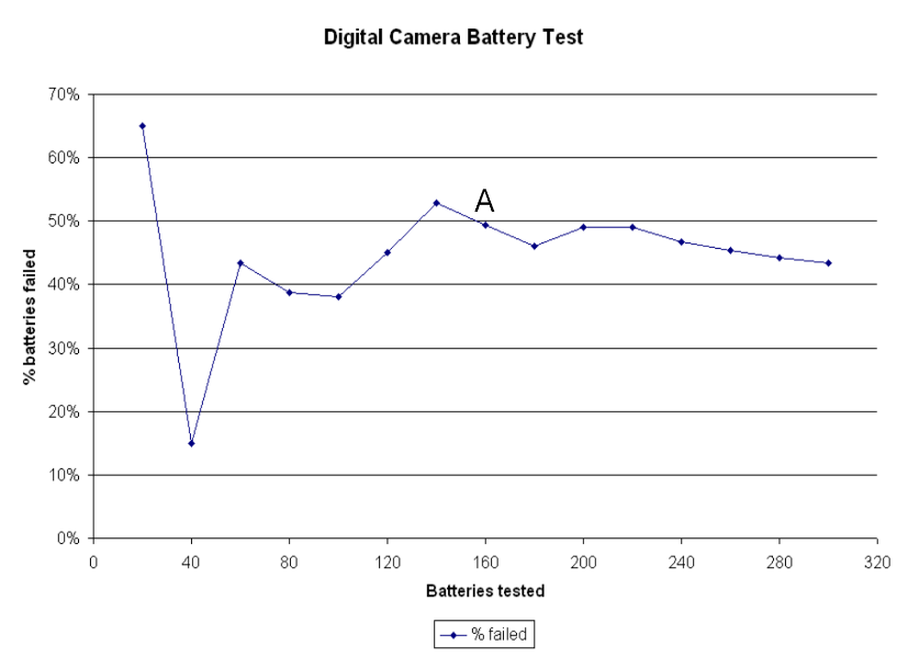 A company is testing their batteries in digital cameras to see if they last long enough to take 500 pictures. Each day they test 20 batteries and graph the overall percentage of the batteries that have failed the test so far.