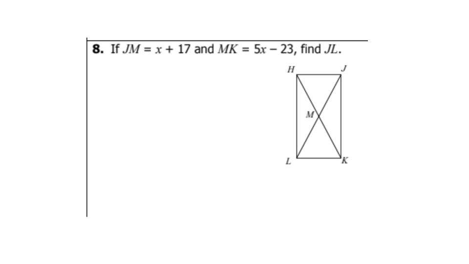 JM and MK are congruent. Solve this like 7 from the notes on the front, but multiply by 2 at the end instead of dividing by 2.