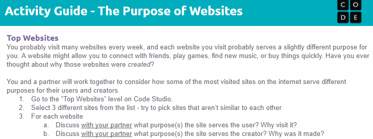 2.1 code.org- Exploring Websites (CS Discoveries Web Development)