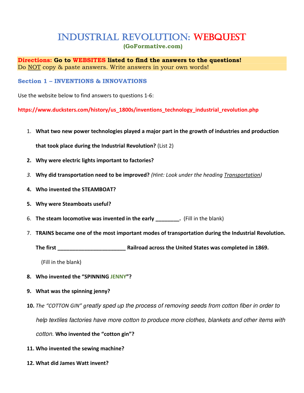 What two new power technologies played a major part in the growth of industries and production that took place during the Industrial Revolution? (List 2)