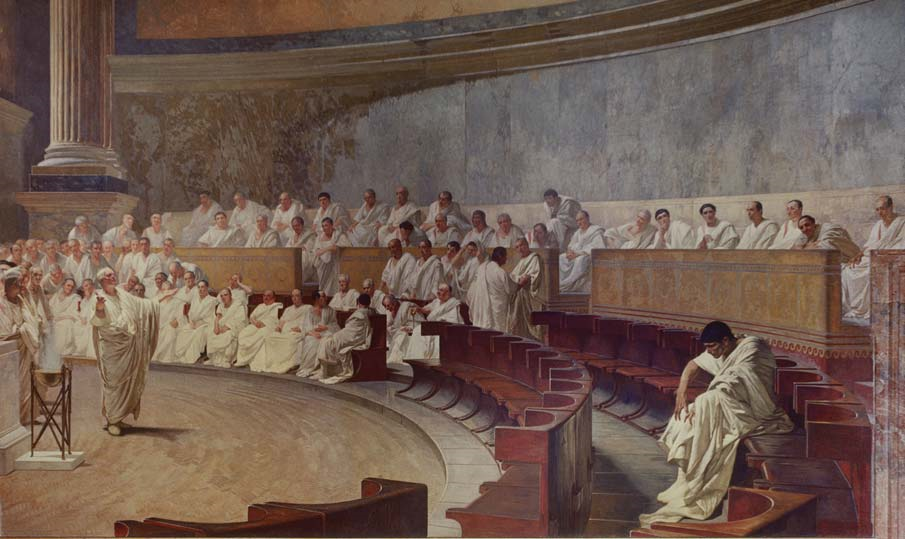 Tunc Mārcus Tullius Cicero cōnsul longam et lūculentam ōrātiōnem in cūriā habet.