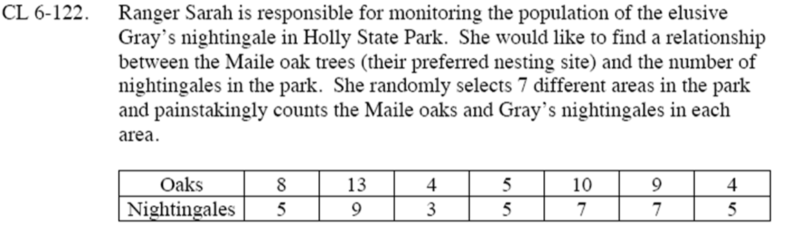Ranger Sarah went back to the plot with 5 oaks and counted 4 Nightingales. What is the residual value?
