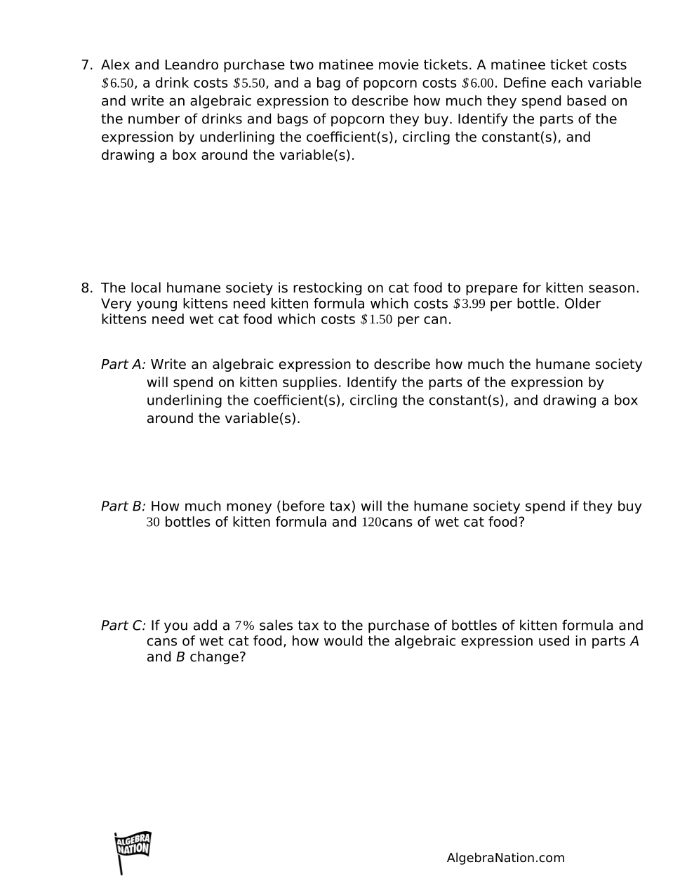 Let m = number of manitee ticketsLet d = number of drinkslet p = number of bags of popcorn