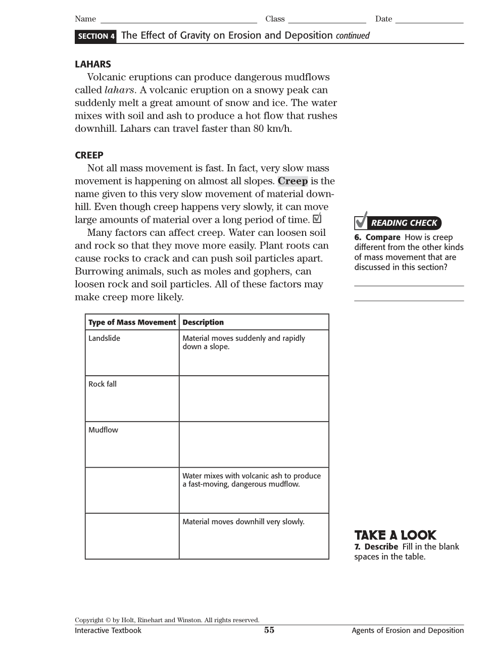 How is creep different from the other kinds of mass movement that are discussed in this section?
