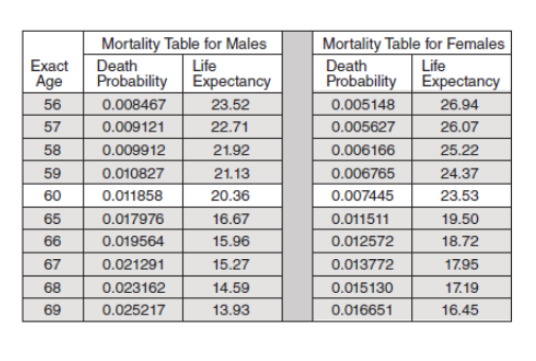 Based on the table, what is the probability that a 56-year-old female will live to her 57th birthday?