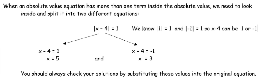 |x| = 5 | arrow_right_alt | x = 5 and x = -5 |