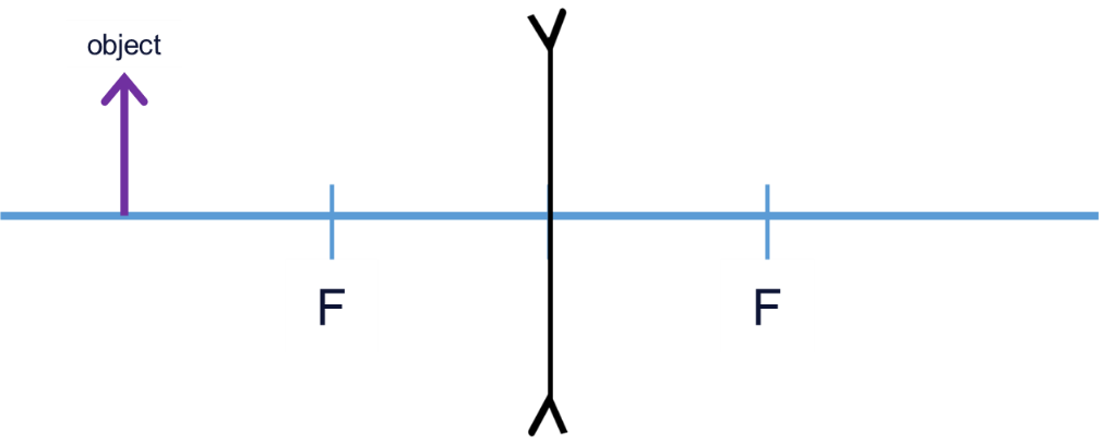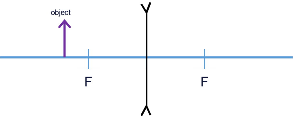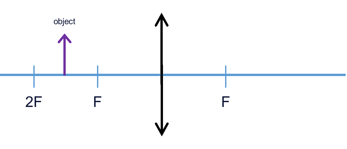 Describe an image of an object placed between 1 and 2 focal lengths away from a convex lens.