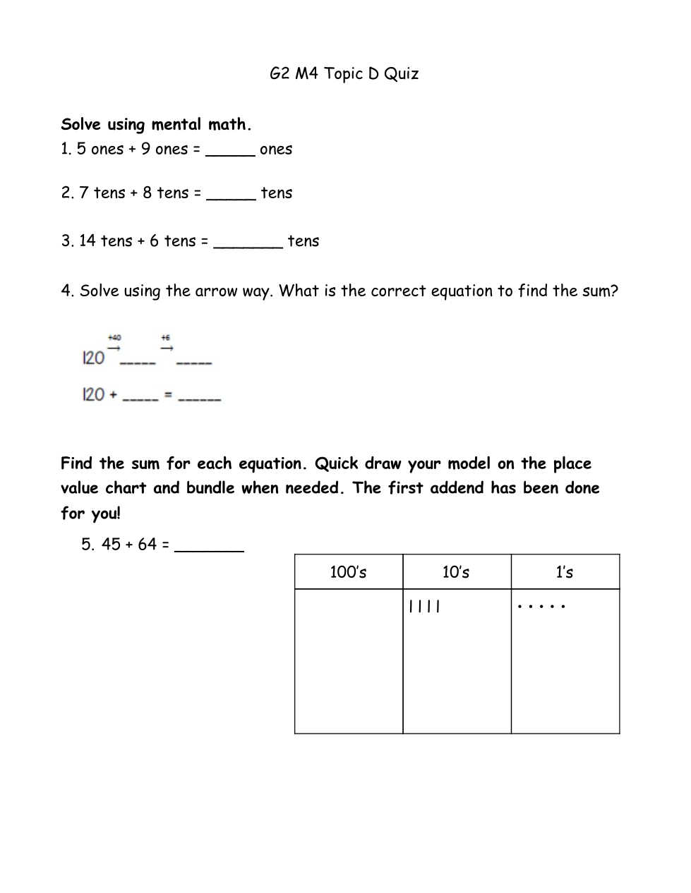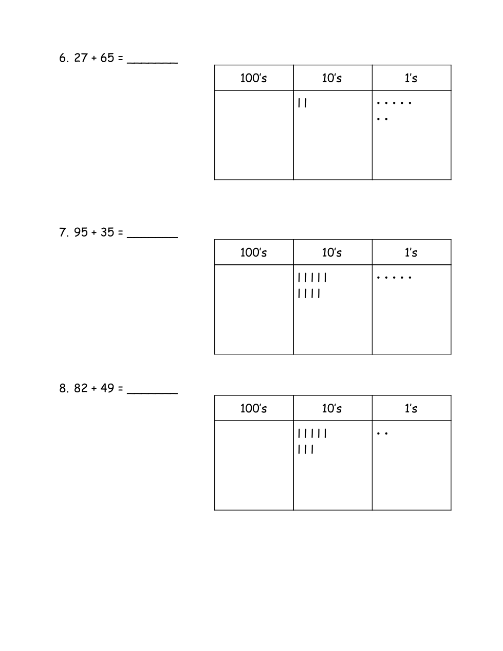 Find the sum for each equation. Quick draw your model on the place value chart & bundle when needed.