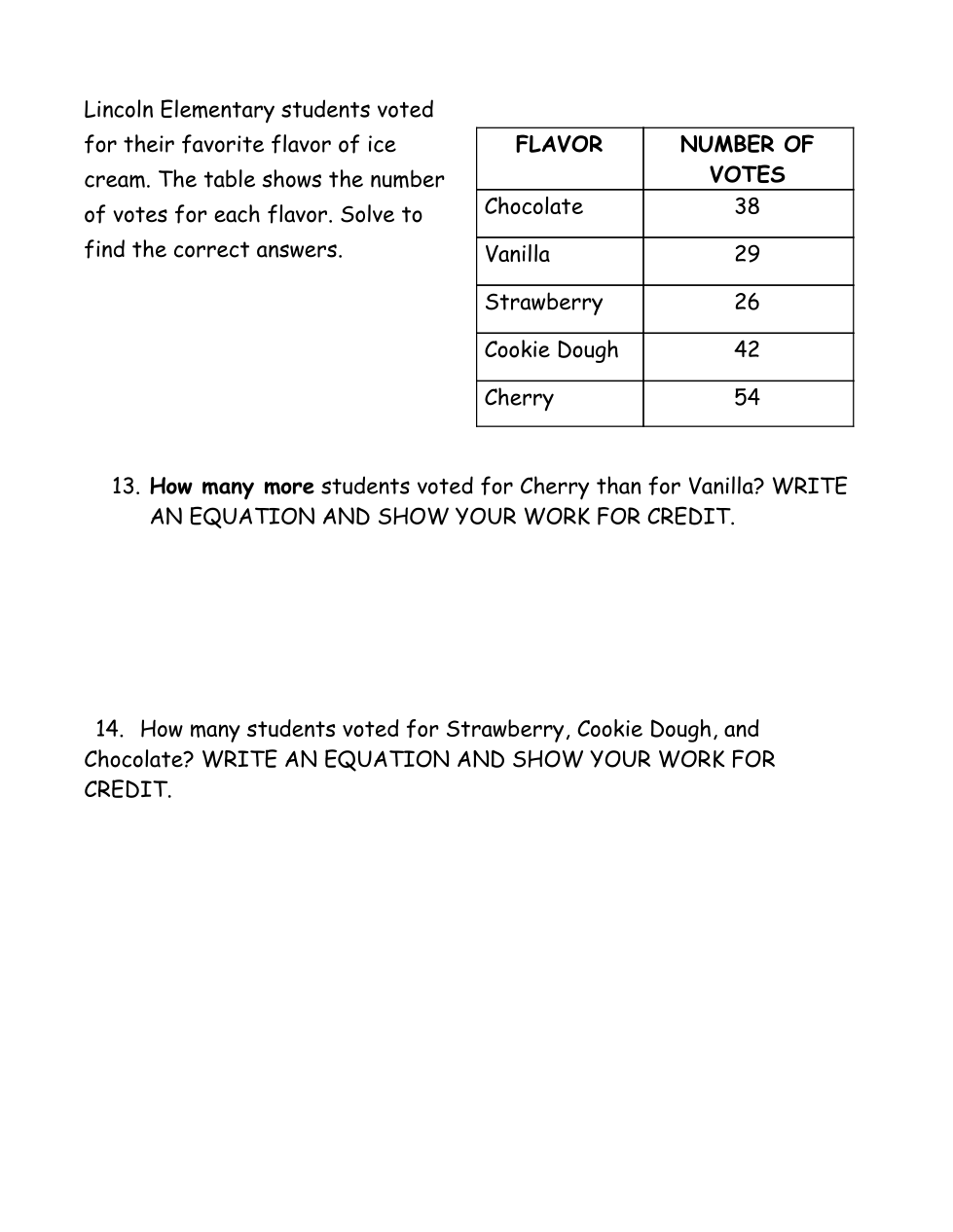 How many more many more students voted for Cherry than for Vanilla? Write an equation, choose a strategy, show your work, and circle your final answer.