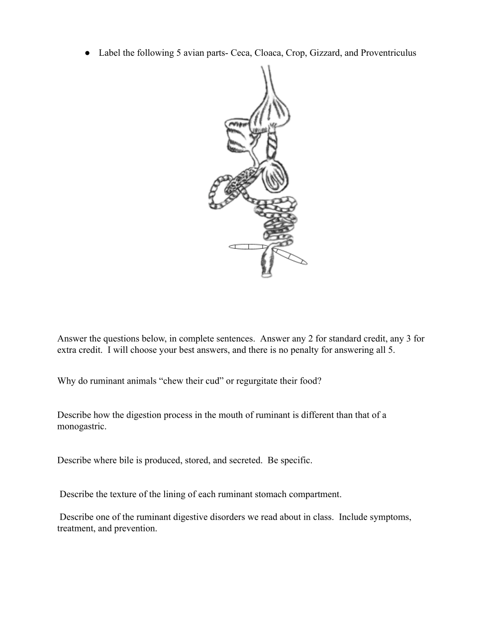 Label the 5 avian parts: ceca, cloaca, crop, gizzard, and proventriculus. Use the method we practiced, entering text and drawing lines, please. If I can't read it, it's wrong. Message me DURING the test if you're having technical difficulties.