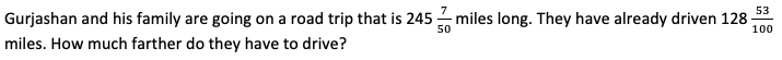Gurjashan and his family are going on a road trip that is 245 7/50 miles long. They have already driven 128 53/100 miles. How much farther do they have to drive?
