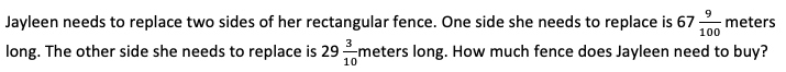 Jayleen needs to replace two sides of her rectangular fence. One side she needs to replace is 67 9/100 meters long. The other side she needs to replace is 29 3/10 meters long. How much fence does Jayleen need to buy?