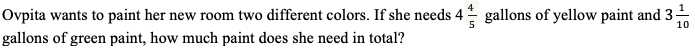 Ovpita wants to paint her new room two different colors. If she needs 4 4/5 gallons of yellow paint and 3 1/10 gallons of green paint, how much paint does she need in total?