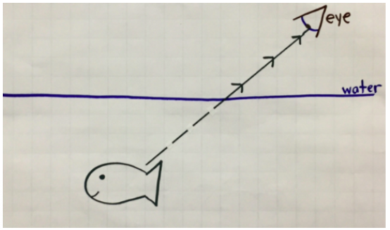 A student went spearfishing during summer vacation the student aimed the spear at the location of the fish they saw in the water. The fish did not move when the spear entered the water, however the student did not catch the fish. THe initial model below shows one of the fish the student observed.