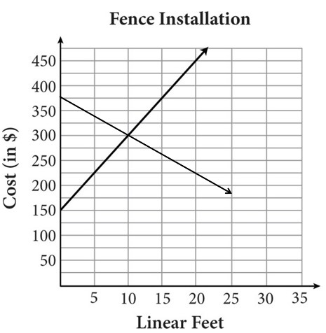 The graph shows the cost of installing a vinyl privacy fence. The company A charges a flat installation fee plus a cost per linear foot of fencing. Company B charges installation fee plus a cost per linear foot of fencing, but the more you purchase the bigger the discount.