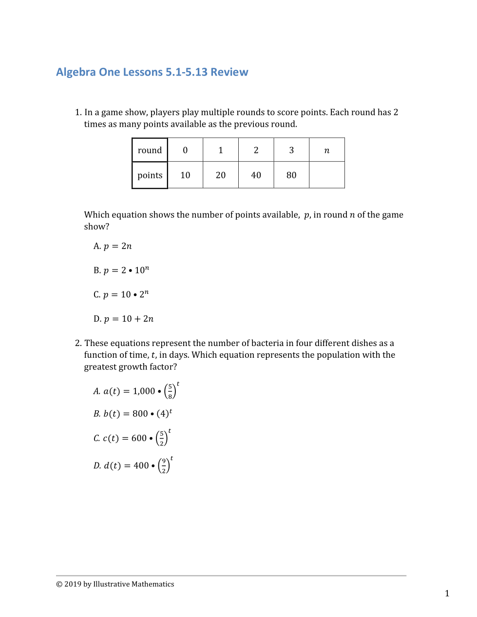 Kelso Math A! #19.5 IM-Algebra 1-Review for test 5.1-5.13