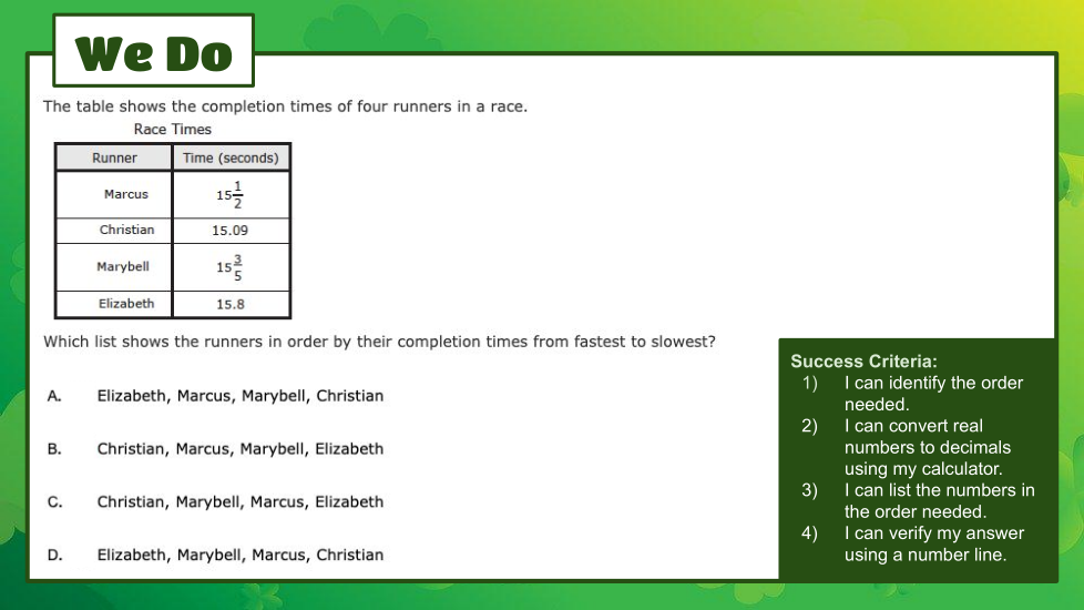 Look at the times in question 2. They are all decimals placed in order. If the list is oredered from fastest to slowest, does that mean the biggest decimal is first? Why or why not?